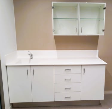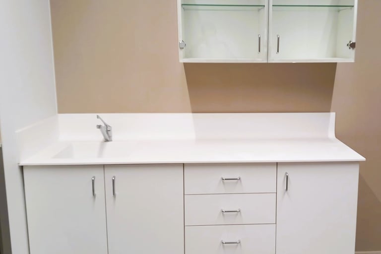Consultas externa, es una zona de atención al publico con un transito constante, por lo que la limpieza de las superficies y manos es constante, el modelo más estándar es de encimera de higiénica r.344/2021 modelo 12r de 1,8 metros con un fregadero integrado modelo FD100, de 40x40x18cm de solid surface blanco.